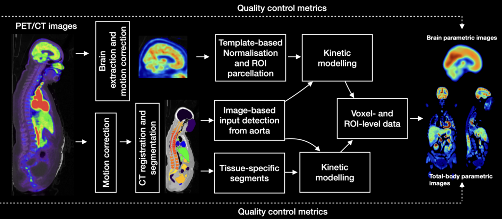 Processing of positron emission tomography (PET) data from single-organ studies (such as brain) data involves intensive manual work, causing inter-operator variance and poor replicability. These issues are mitigated in long axial field of view (Total-body) PET imaging where the large number of target tissues increases manual workload, necessitating a high level of automatization and standardization. Our PET methods development is focussing on developing fully automated pipelines incorporating motion correction, registration, input extraction and modelling, region-of-interest parcellation and kinetic modelling. The MAGIA toolbox is dedicated for brain-only studies whereas the TURBO toolbox is a general-purpose solution for total-body studies and incorporates MAGIA functions for brain analysis. Both toolboxes are open-source and freely available and under active development.